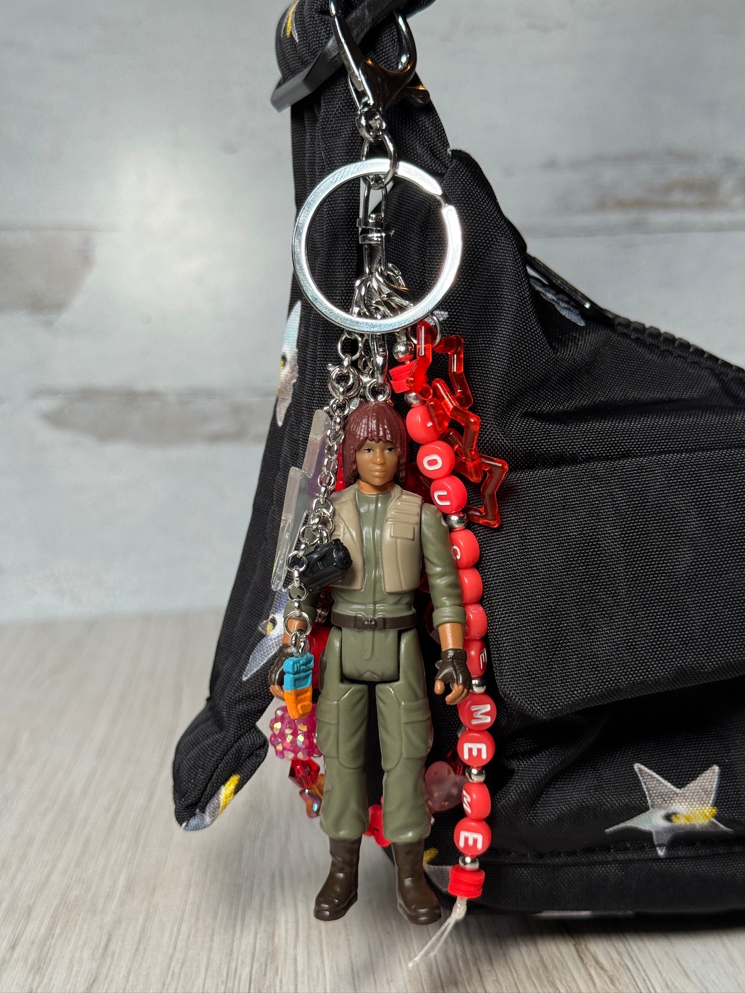 If you're like me and think The Acolyte was seriously underrated, you should snag this bag charm of Osha. Made with a Retro Collection figure, complete with her blaster and Pip made into charms. Also features a beaded loop charm, star link charm, and message charm featuring part of the twins rhyme "You give me me."