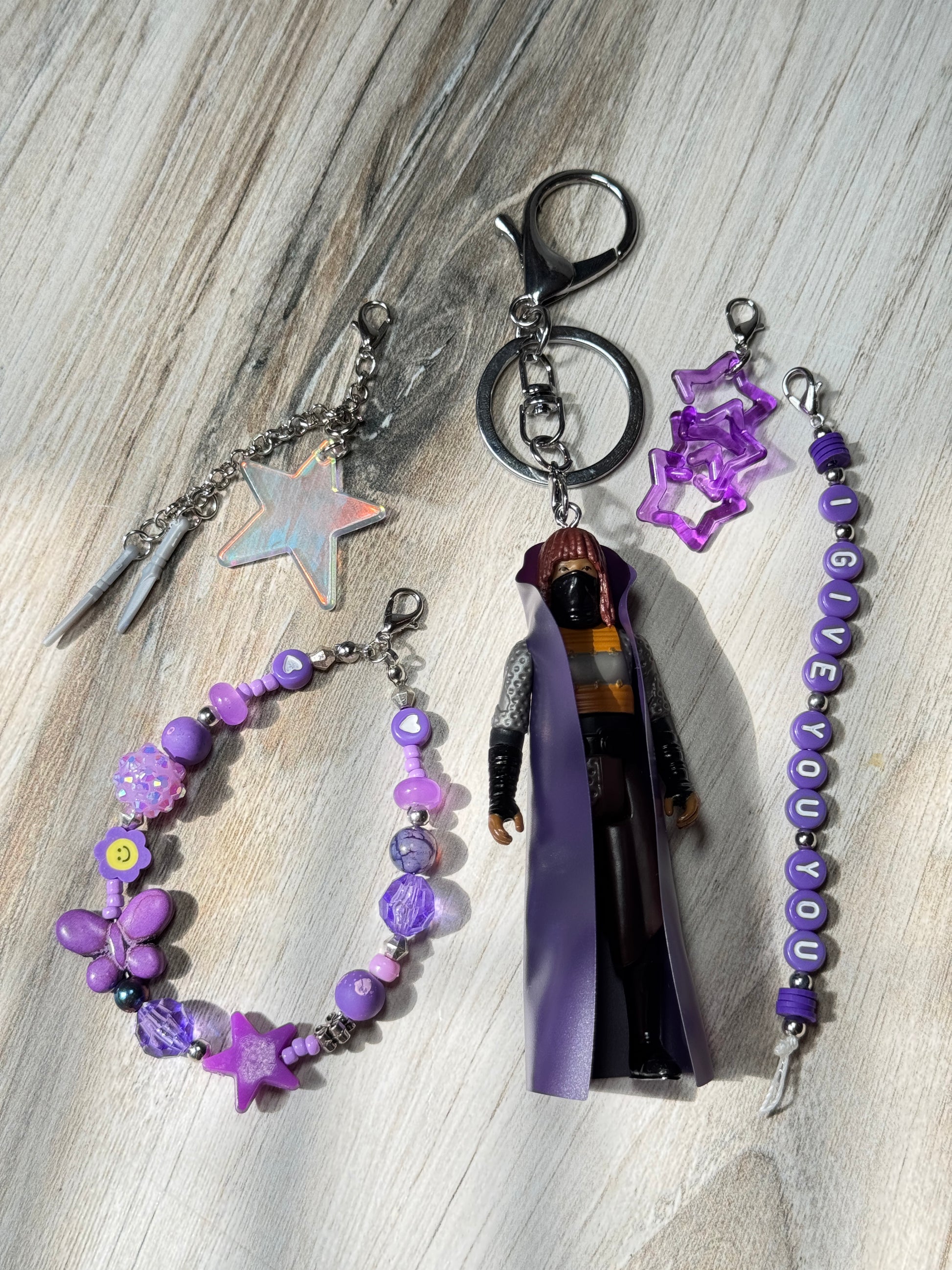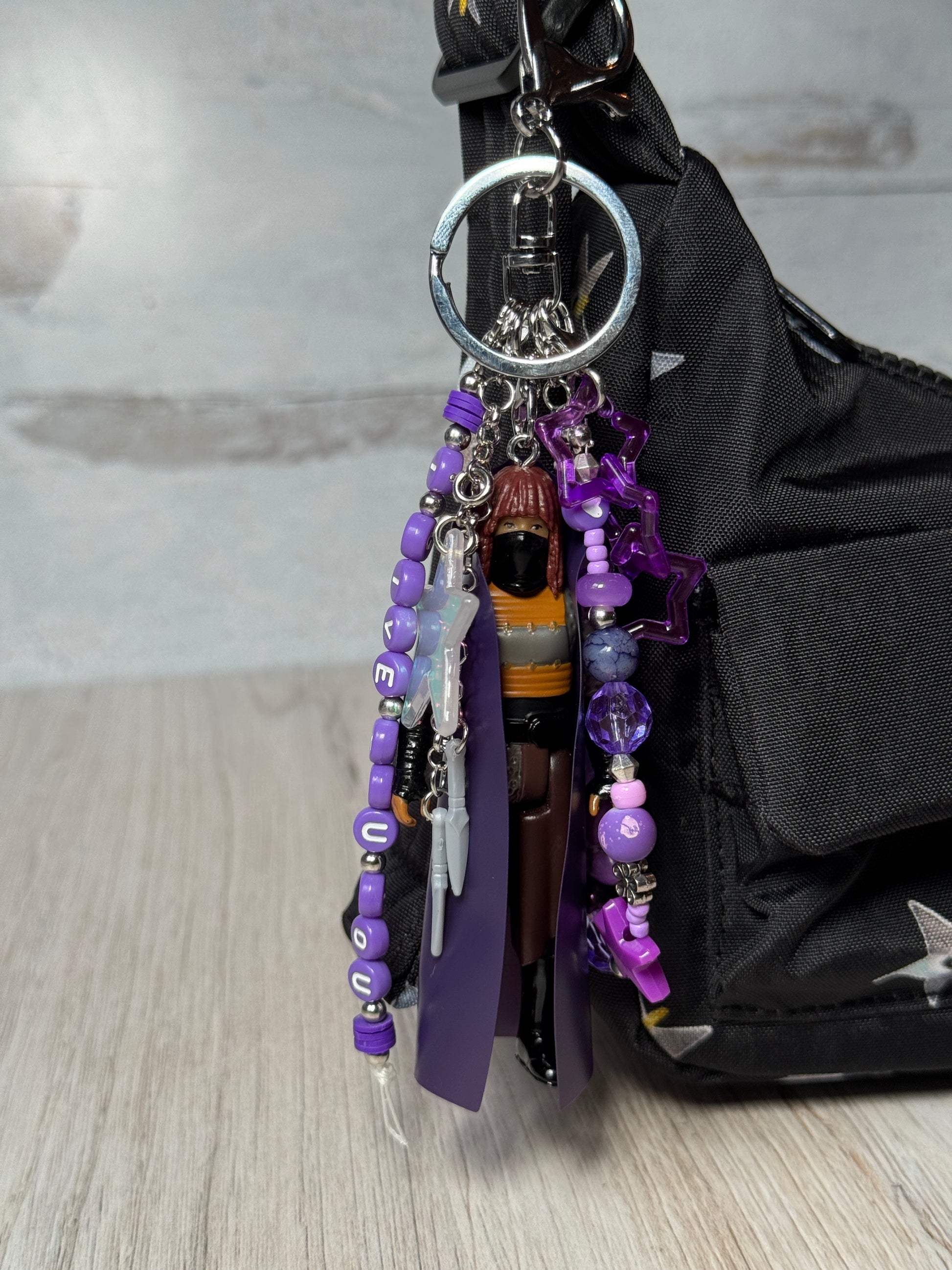 If you're like me and think The Acolyte was seriously underrated, you should snag this bag charm of Mae. Made with a Retro Collection figure, complete with her dagger accessories made into charms. Also features a beaded loop charm, star link charm, and message charm featuring part of the twins rhyme "I give you you."